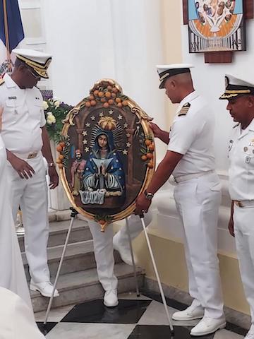 Acompañaron en la entrega de la Virgen el Obispo Monseñor José Dolores Grullón Estrella, obispo diócesis de San Juan de la Maguana, el contralmirante Juan Crisóstomo Martínez, director de Dragas, Presas y Balizamiento; y los capitanes de navío Juan Núñez Abreu, comdte. del Comando Naval de Educación y Entrenamiento; Mayobanex Montero Tapia, director de Asuntos Internacionales: y Mac Donal Belliard González, comdte. del buque escuela “Almirante Juan Bautista Cambiaso.
