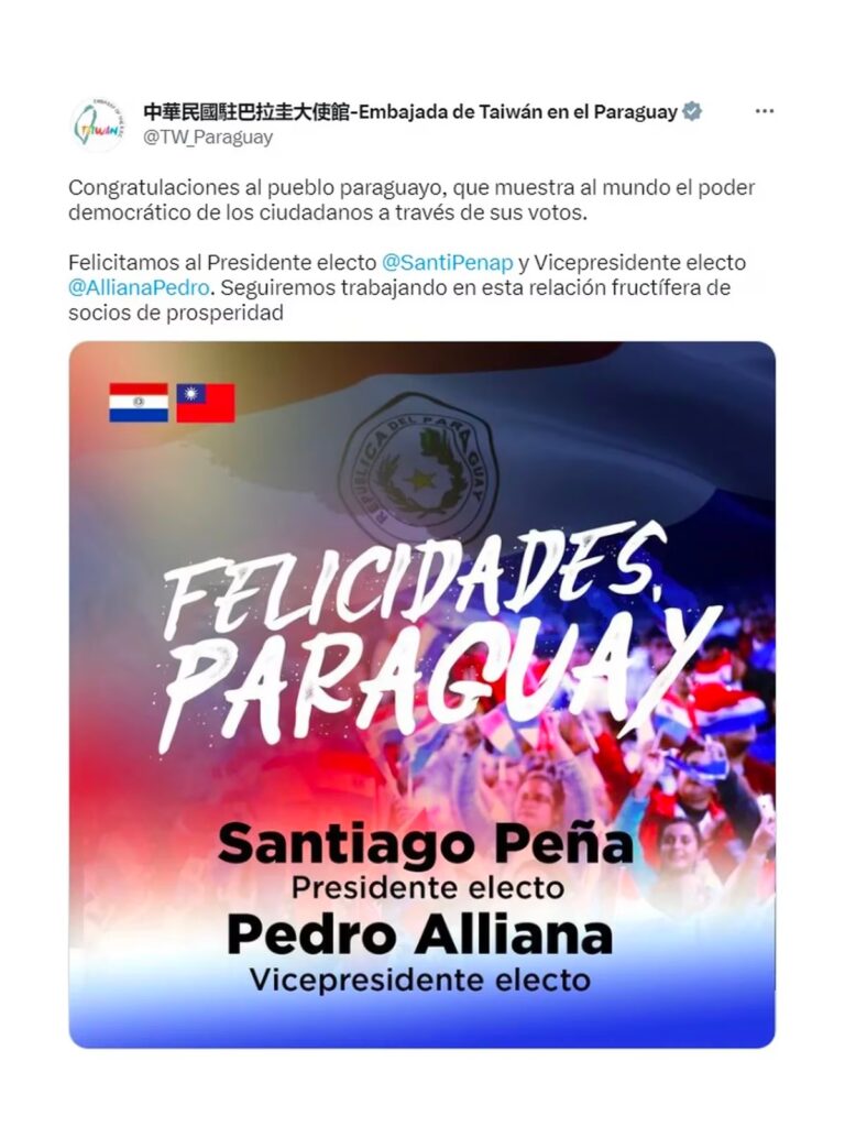 La Cancillería de Taiwán felicitó este lunes al candidato del gobernante Partido Colorado, Santiago Peña, por su victoria en las elecciones de Paraguay, uno de los 13 países que todavía mantienen relaciones oficiales con la isla.