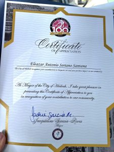 Certificado entregado al artista por la Alcaldía de Hialeah en la Celebración de sus 100 años de Fundada.