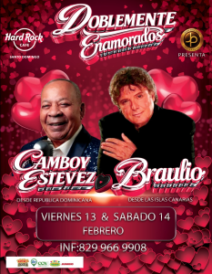 Santo Domingo, R.D. – El amor tendrá banda sonora las noches viernes 13 y sábado 14 de febrero con el espectáculo “Braulio y Camboy Estévez: Dos voces, dos veces para el amor”, Doblemente Enamorados que se presentará en el Hard Rock Café Santo Domingo, bajo la producción general de Juan Pascual.