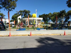 Sorpresivamente, hace varios días fue desmantelada la verja de zinc que cubría la plaza recreativa lo que impedía la vista hacia el interior, lo novedoso consiste en una pequeña oficina para alojar a la Policía Municipal, varias lámparas pintadas color naranja y la construcción de una nueva verja metálica de seguridad que luces bien construida .